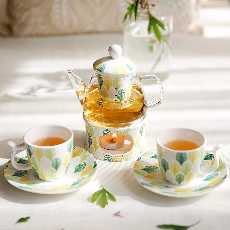 √ 配有:2杯碟+1茶壶+1底座。内部可放蜡烛温茶,烛光在釉面投下绿叶摇曳的影子,茶烟仿佛森林升起的薄雾帷幕;