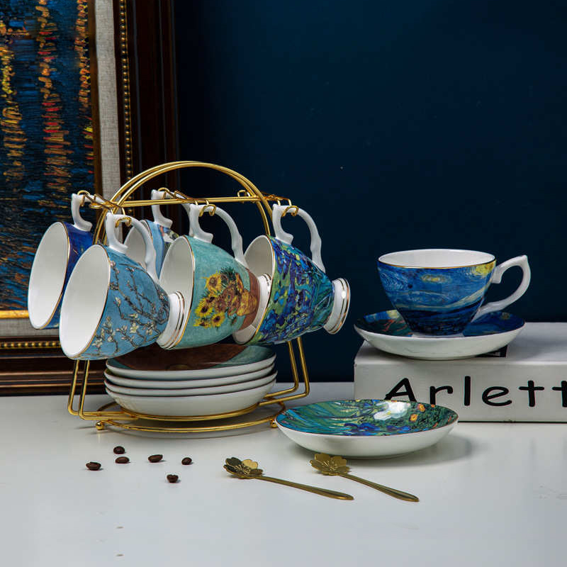 梵高油画绽于骨瓷,轻奢欧式杯碟相衬,品茗间,艺术与优雅共舞。