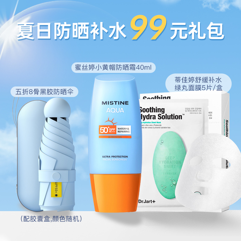夏日防晒舒缓补水99元大礼包(蜜丝婷小黄帽防晒40ml+蒂佳婷绿丸面膜5片+黑胶防晒伞)