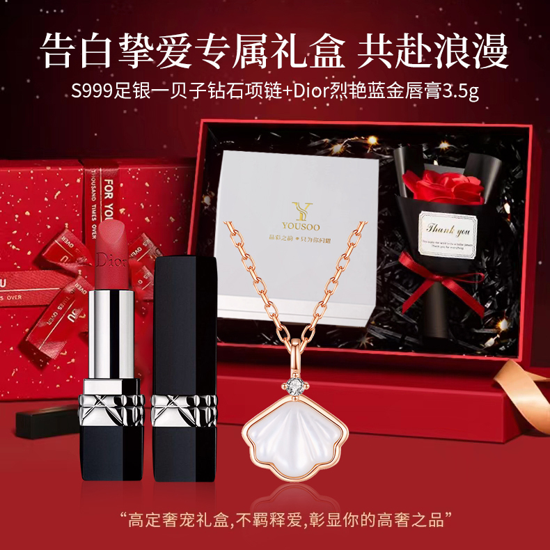 S999足银一贝子钻石项链+Dior烈艳蓝金唇膏3.5g+玫瑰花礼盒