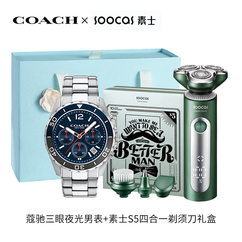 首页 > 手表 > 石英手表 >  蔻驰三眼夜光防水男士手表+素士四合一剃须刀高档礼盒