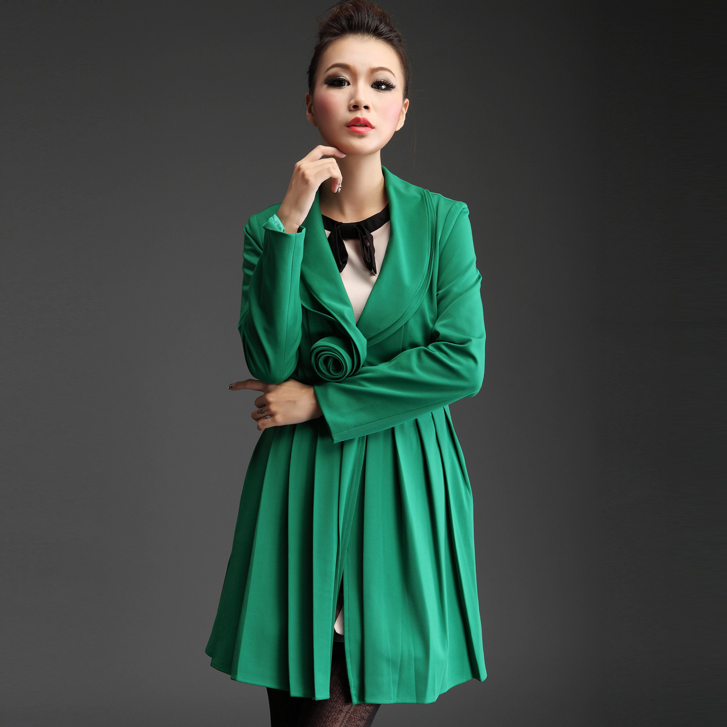 | | | | | 复古优雅的风衣充满迷人气质,彷如欧洲旧电影里的女主角一般优雅迷人。面料垂坠分量十足,手感顺滑。腰间缀有玫瑰典雅大方,下摆百褶更是用量十足,让你行动间裙袂飞扬,气场十足。 | |