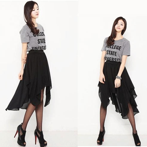2013春夏新款欧美风纯色不规则雪纺长裙(前短后长)